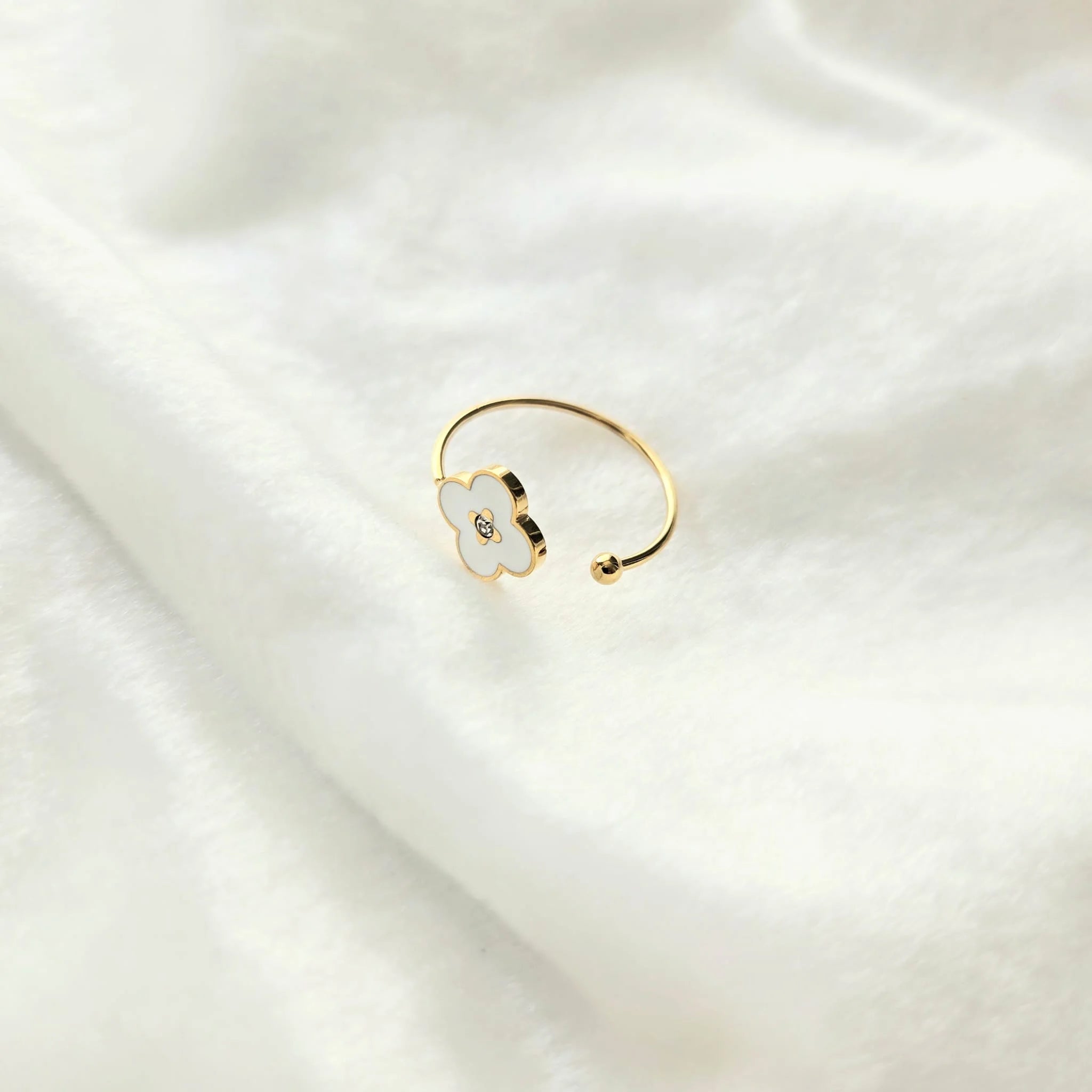 Design : Fleur émaillée blanche à contours dorés, sertie d’un zircon central. Anneau fin à boule décorative.