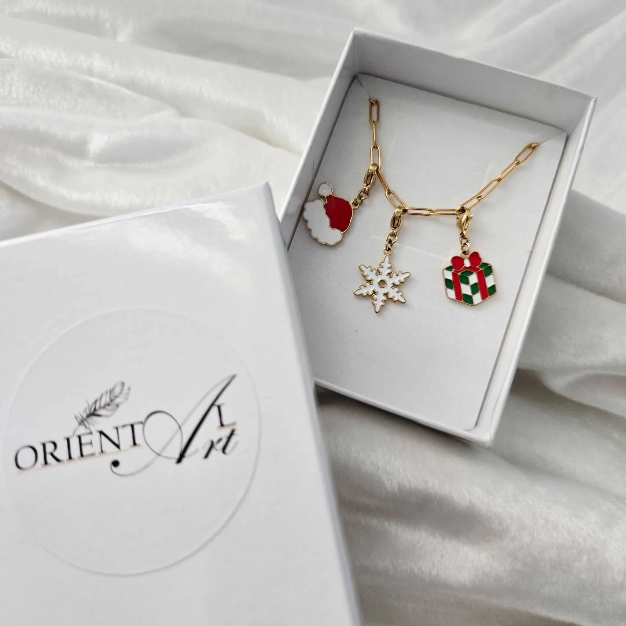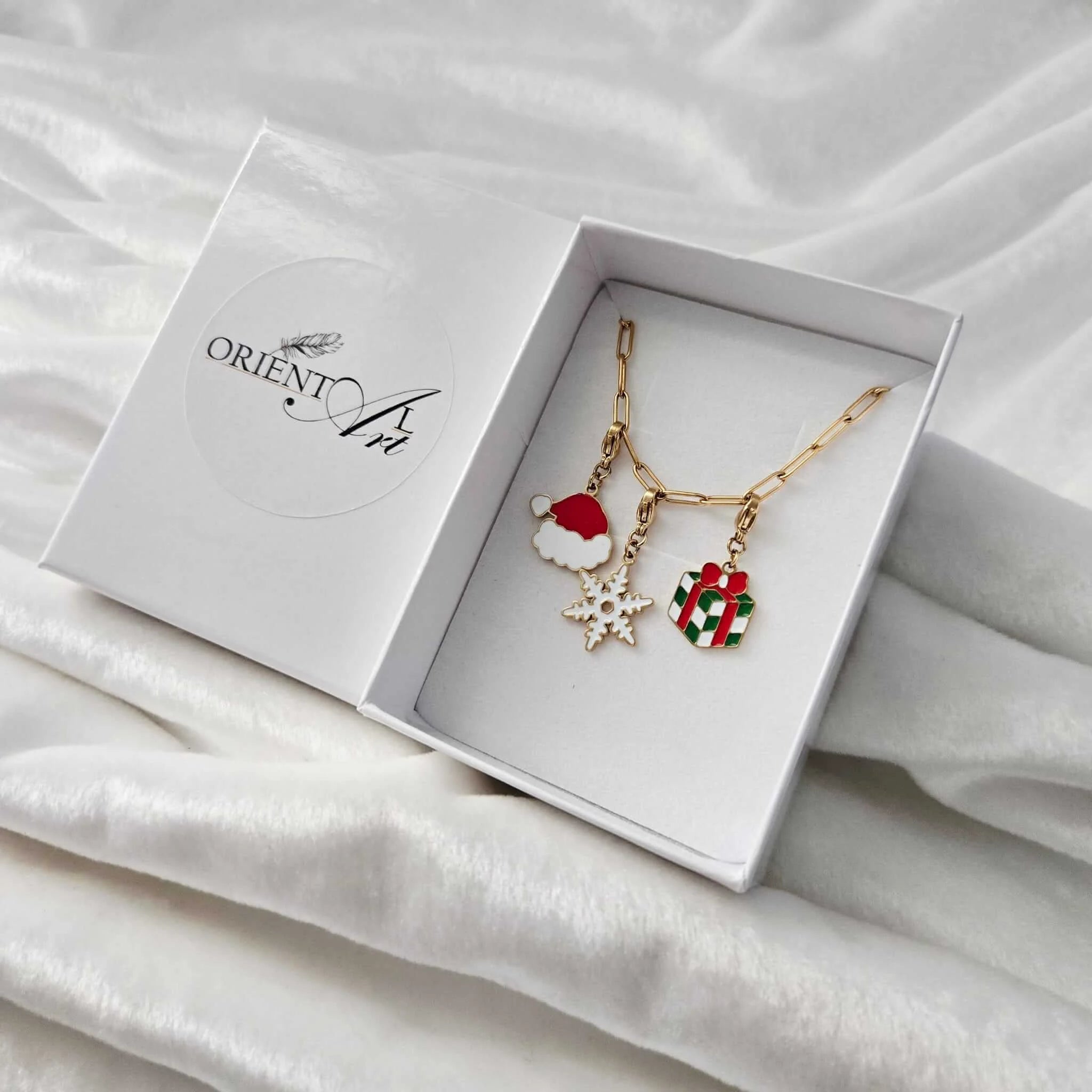 Apportez la magie de Noël à votre poignet avec le bracelet Joyeux Charme. Fabriqué en acier inoxydable doré, il est orné de trois breloques festives – un bonnet de Père Noël, un flocon de neige scintillant et un cadeau coloré. Sa chaîne à maillons larges lui donne un style moderne tout en restant léger et agréable à porter. Parfait pour les fêtes ou à offrir comme petit bijou symbolique.