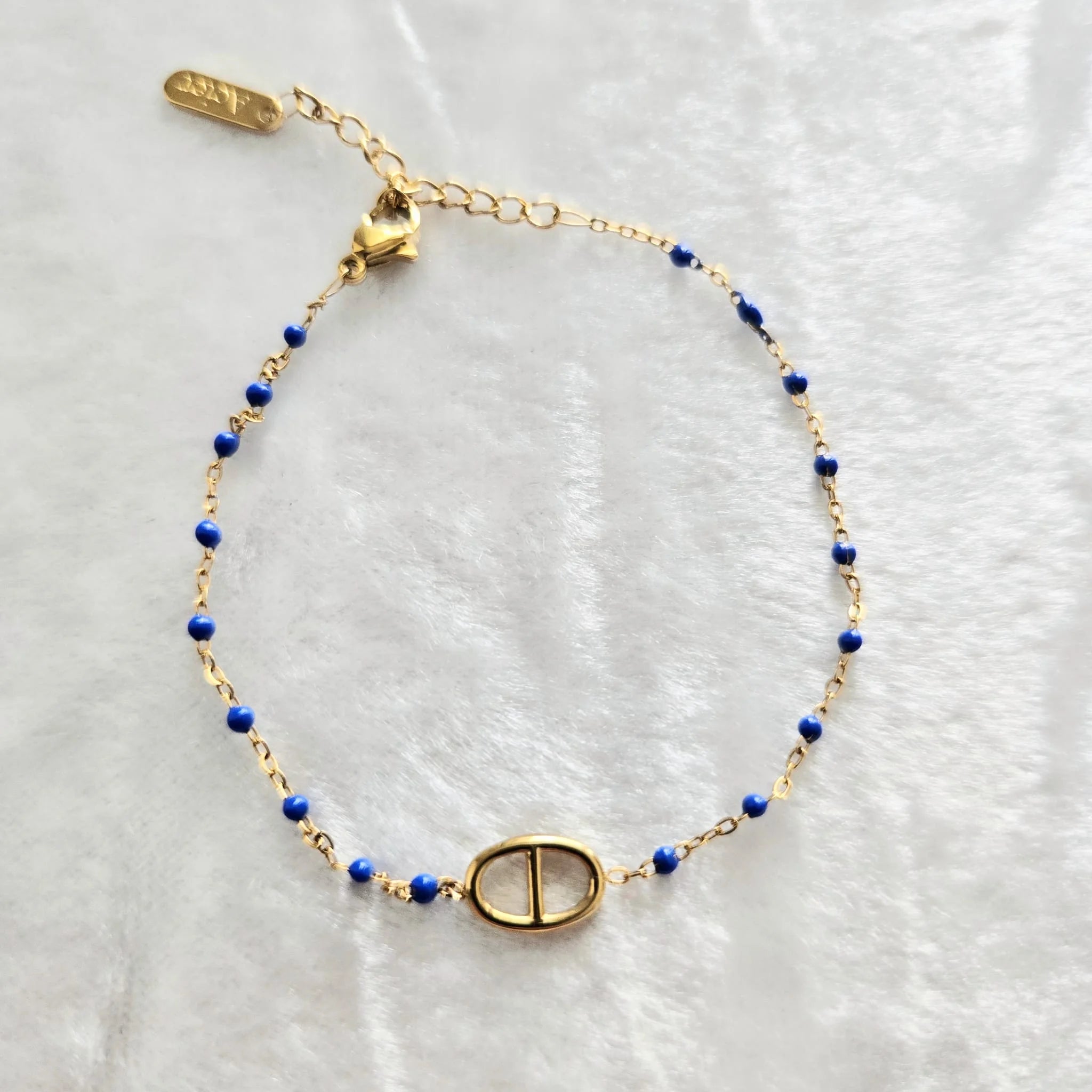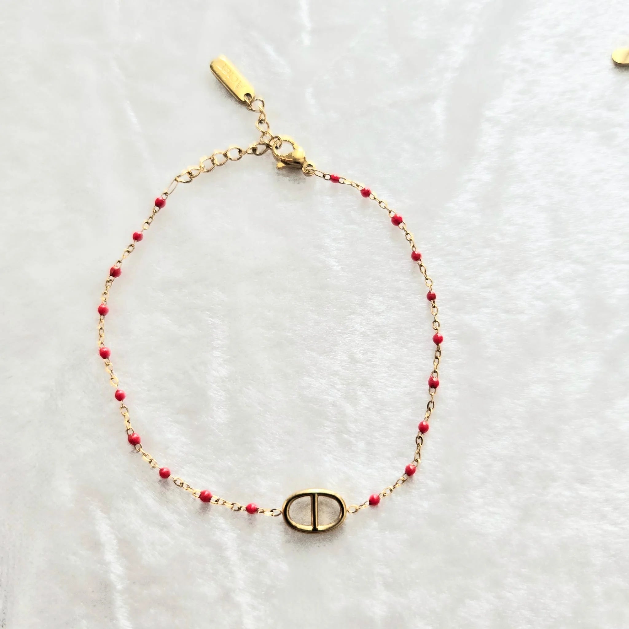 Le bracelet Nouria se distingue par sa finesse et son élégance. Composé d'une chaîne dorée ornée de petites perles émaillées colorées (rouge ou bleu), il est sublimé par un maillon central ovale à l’allure contemporaine. Un bijou discret mais raffiné qui habille le poignet avec légèreté.
