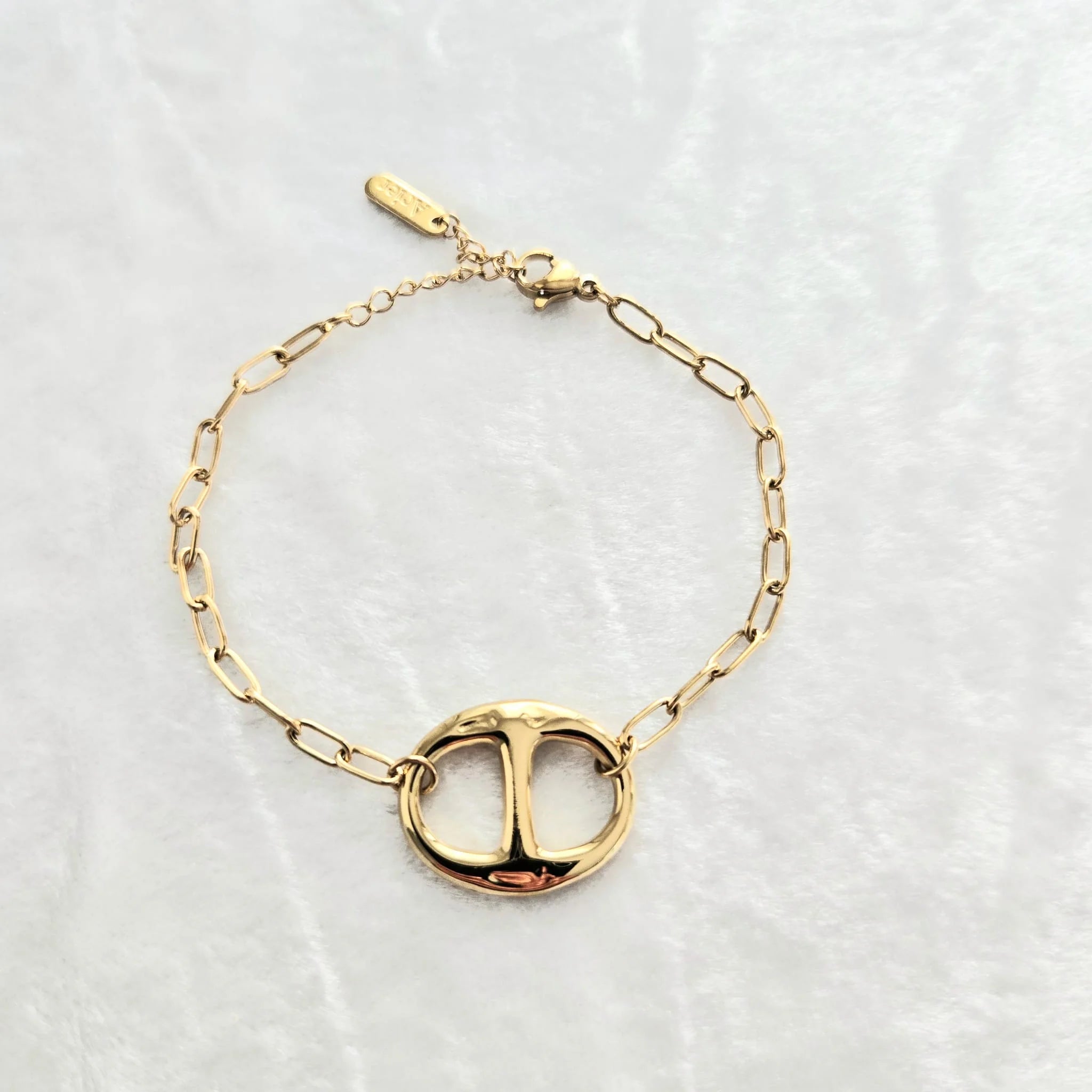 Confectionné en acier inoxydable 316L doré, il se distingue par son maillon large et son médaillon central à l’esthétique épurée, évoquant un symbole d’élégance et de caractère.