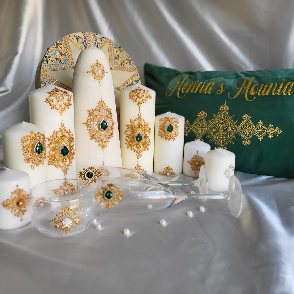 Selon certaine traditions maghrébine, le jour du henné est symbolique par différentes coutumes, lors de cette soirée elle est représentée par un assortiment de bougies posé en décoration sur la table d'honneur. Les deux prénoms des futurs mariés sont inscrits sur deux bougies. Les chandeliers sont allumés au henné de la mariée tout en étant accompagné de chants traditionnels et de musique orientale et/ou instrumentalisé.