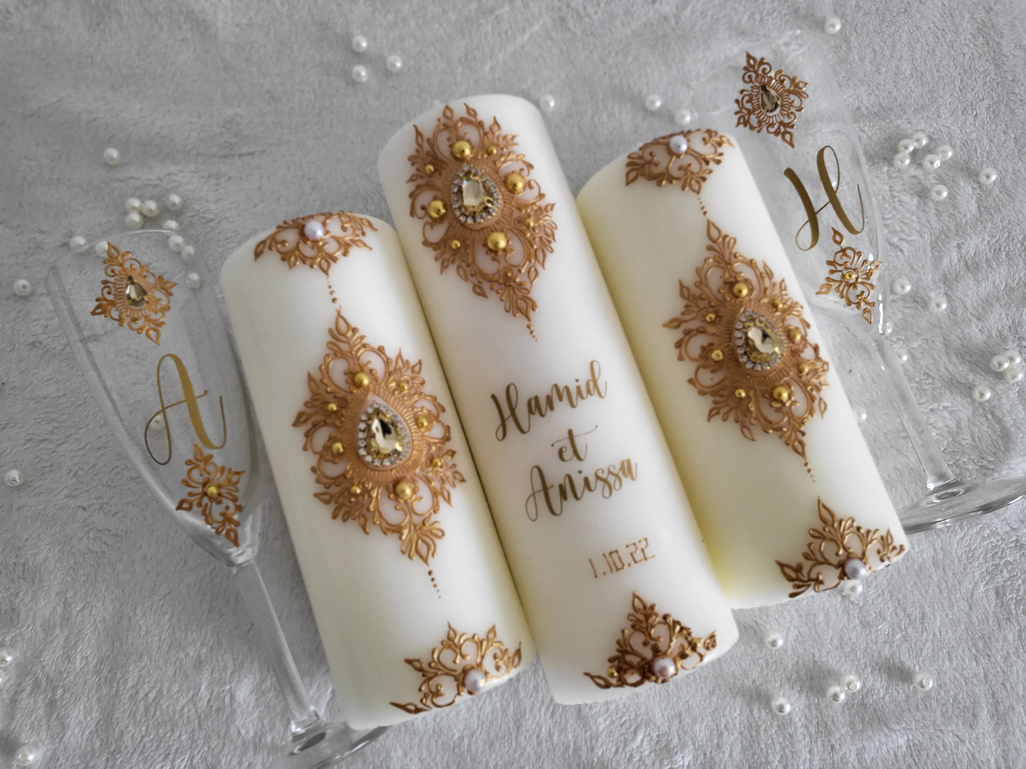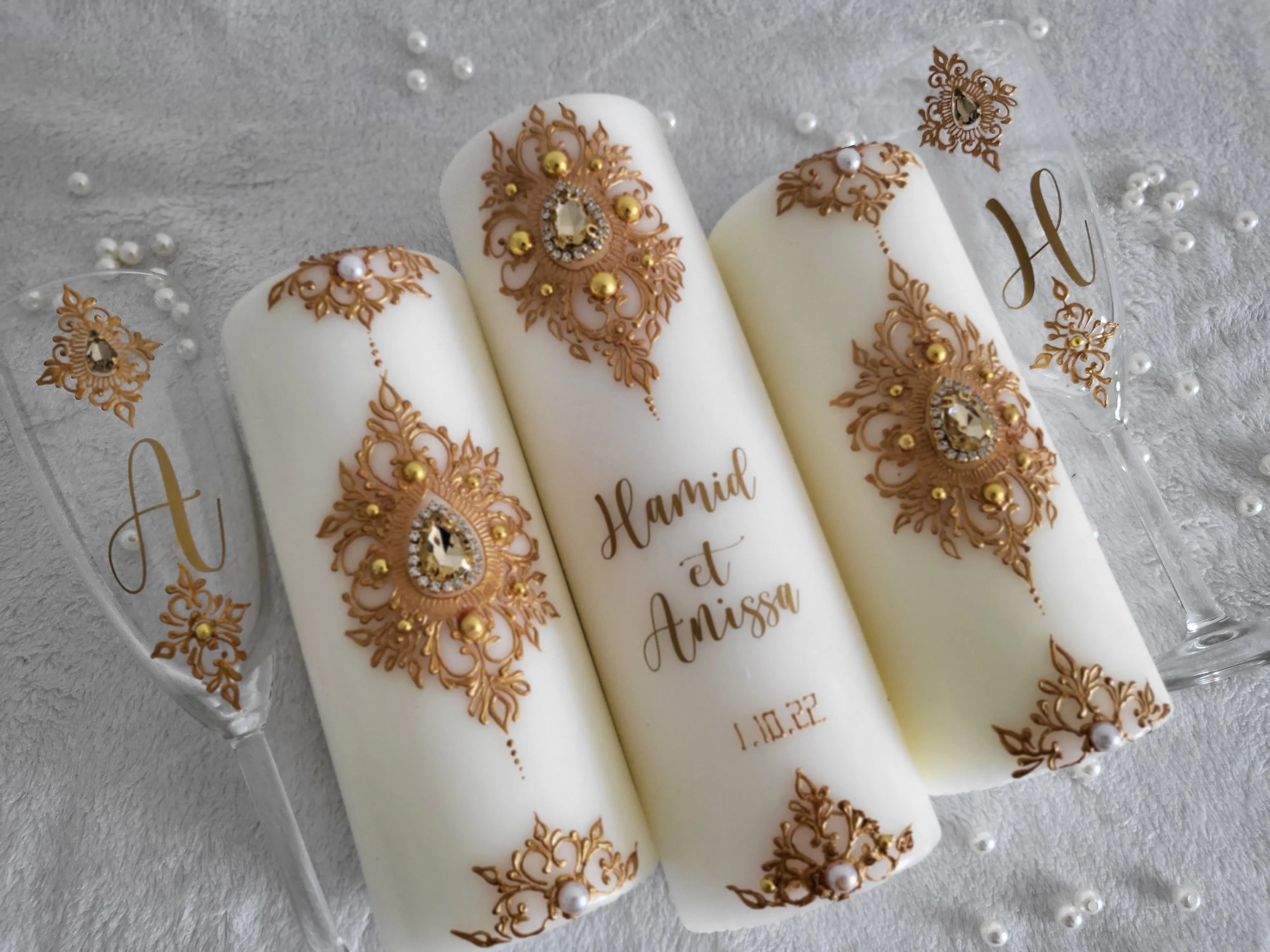 Ajoutez une touche traditionnelle et élégante à votre cérémonie du henné avec notre coffret de bougies personnalisées. Inspiré des coutumes maghrébines, cet assortiment symbolique est conçu pour sublimer la table d'honneur et créer une ambiance chaleureuse et raffinée.