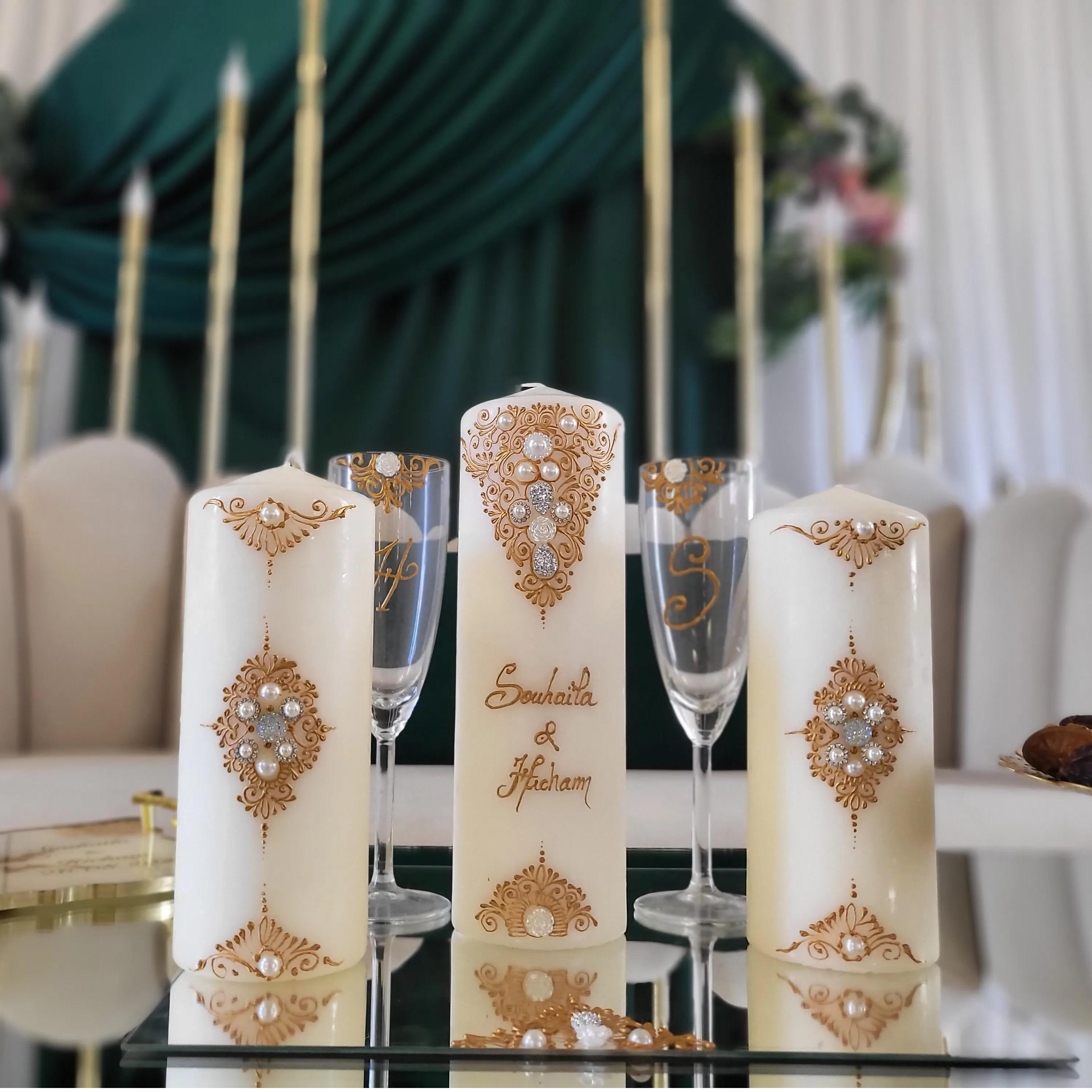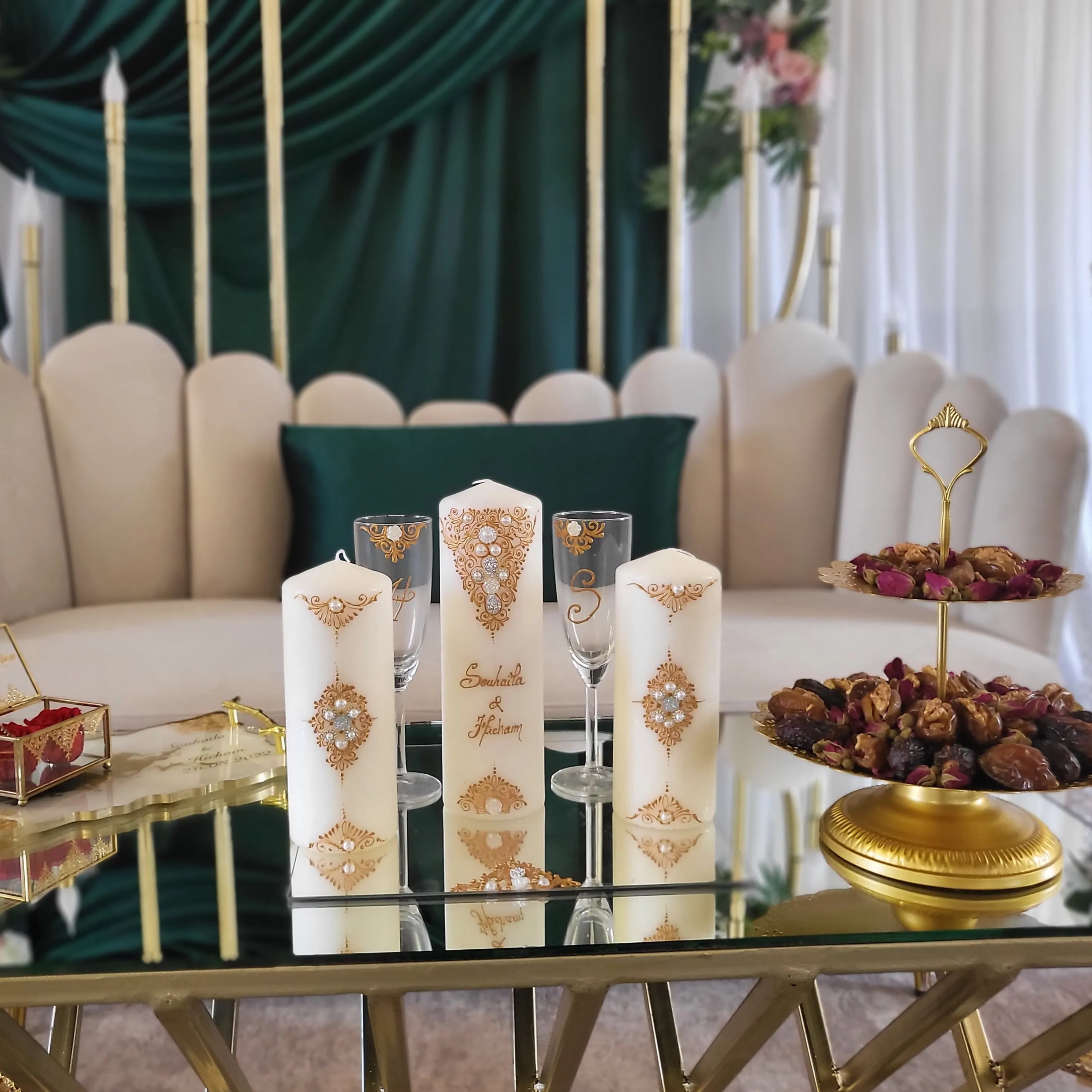 Selon certaine traditions maghrébine, le jour du henné est symbolique par différentes coutumes, lors de cette soirée elle est représentée par un assortiment de bougies posé en décoration sur la table d'honneur. Les deux prénoms des futurs mariés sont inscrits sur deux bougies et ou sur la bougie centrale au choix en commentaire.