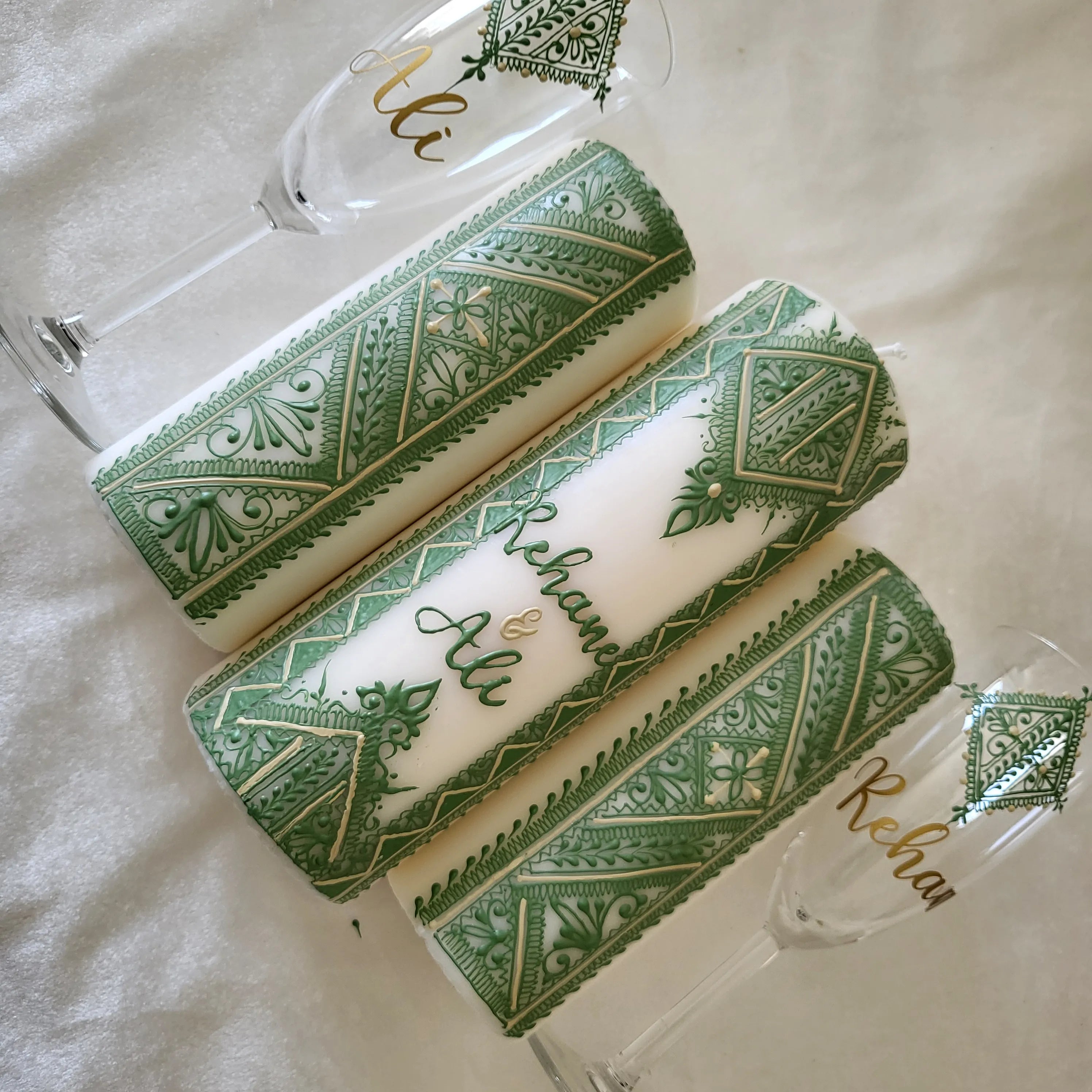 Selon certaine traditions maghrébine, le jour du henné est symbolique par différentes coutumes, lors de cette soirée elle est représentée par un assortiment de bougies posé en décoration sur la table d'honneur. Les deux prénoms des futurs mariés sont inscrits sur deux bougies et ou sur la bougie centrale au choix en commentaire.