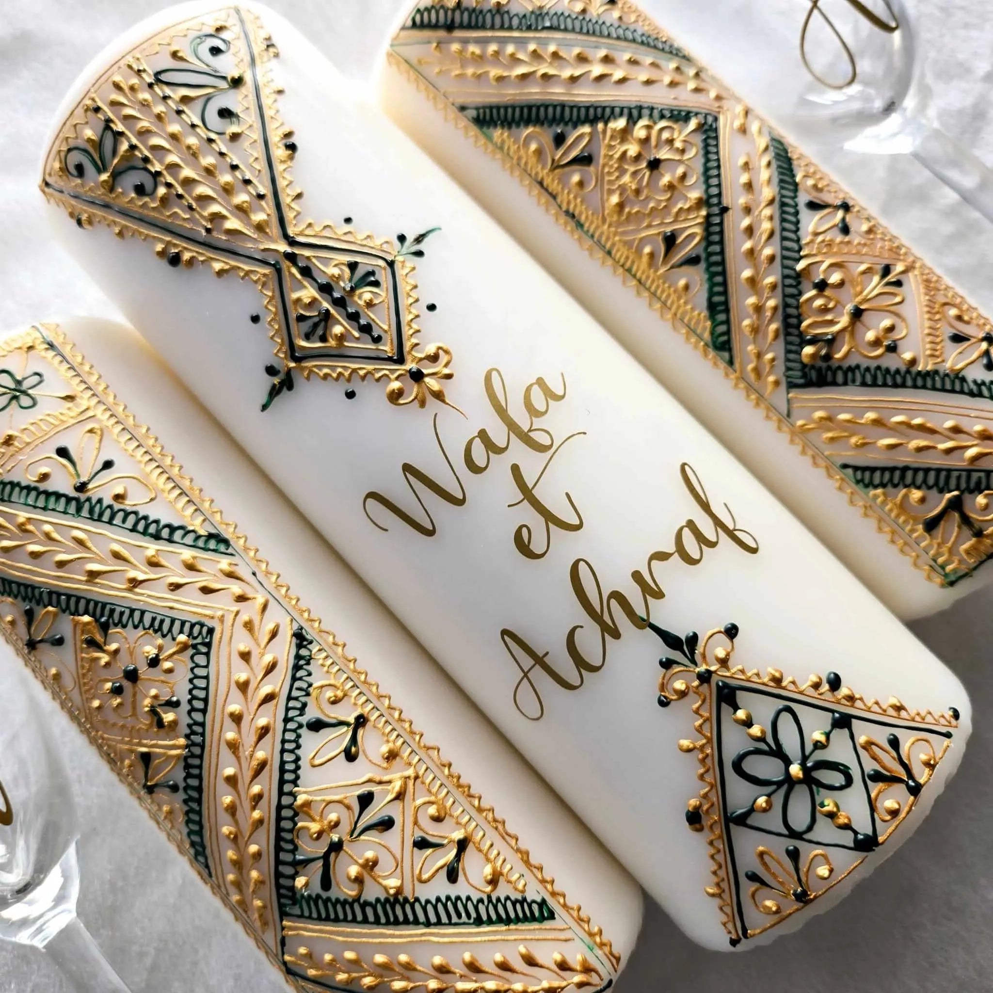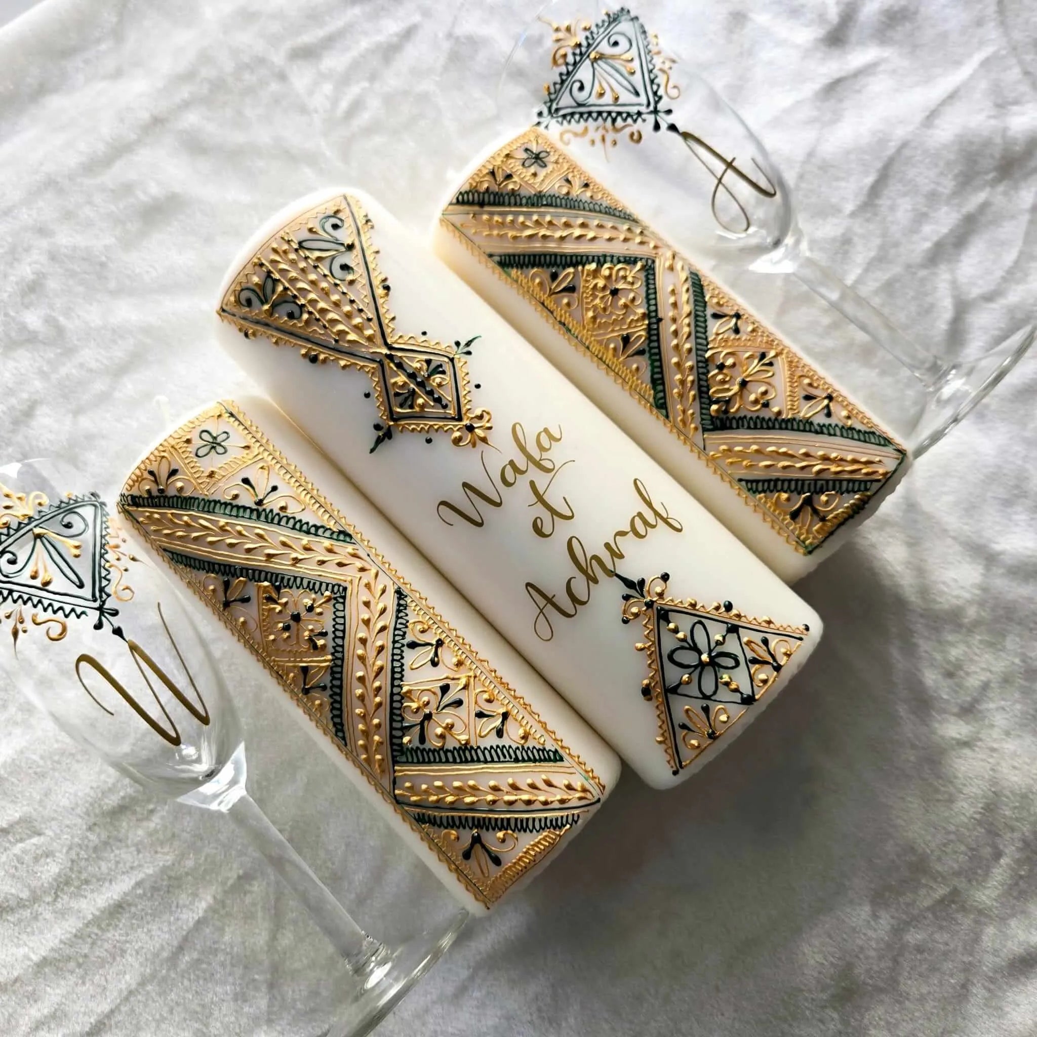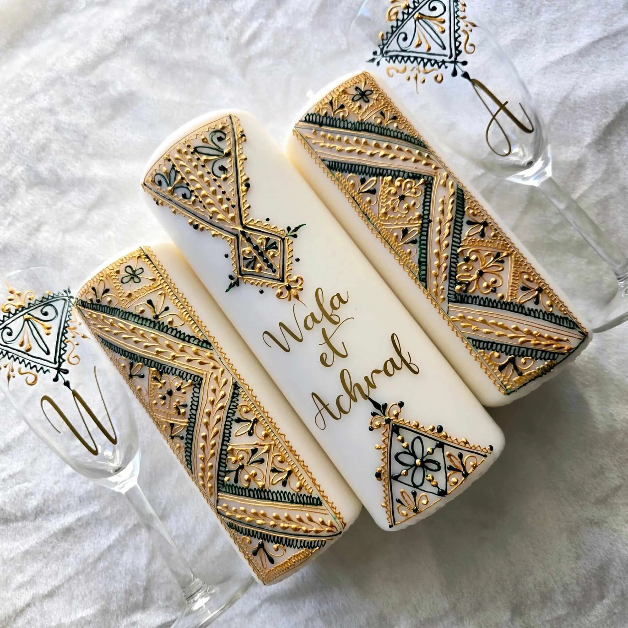 Selon certaine traditions maghrébine, le jour du henné est symbolique par différentes coutumes, lors de cette soirée elle est représentée par un assortiment de bougies posé en décoration sur la table d'honneur. Les deux prénoms des futurs mariés sont inscrits sur deux bougies et ou sur la bougie centrale au choix en commentaire.
