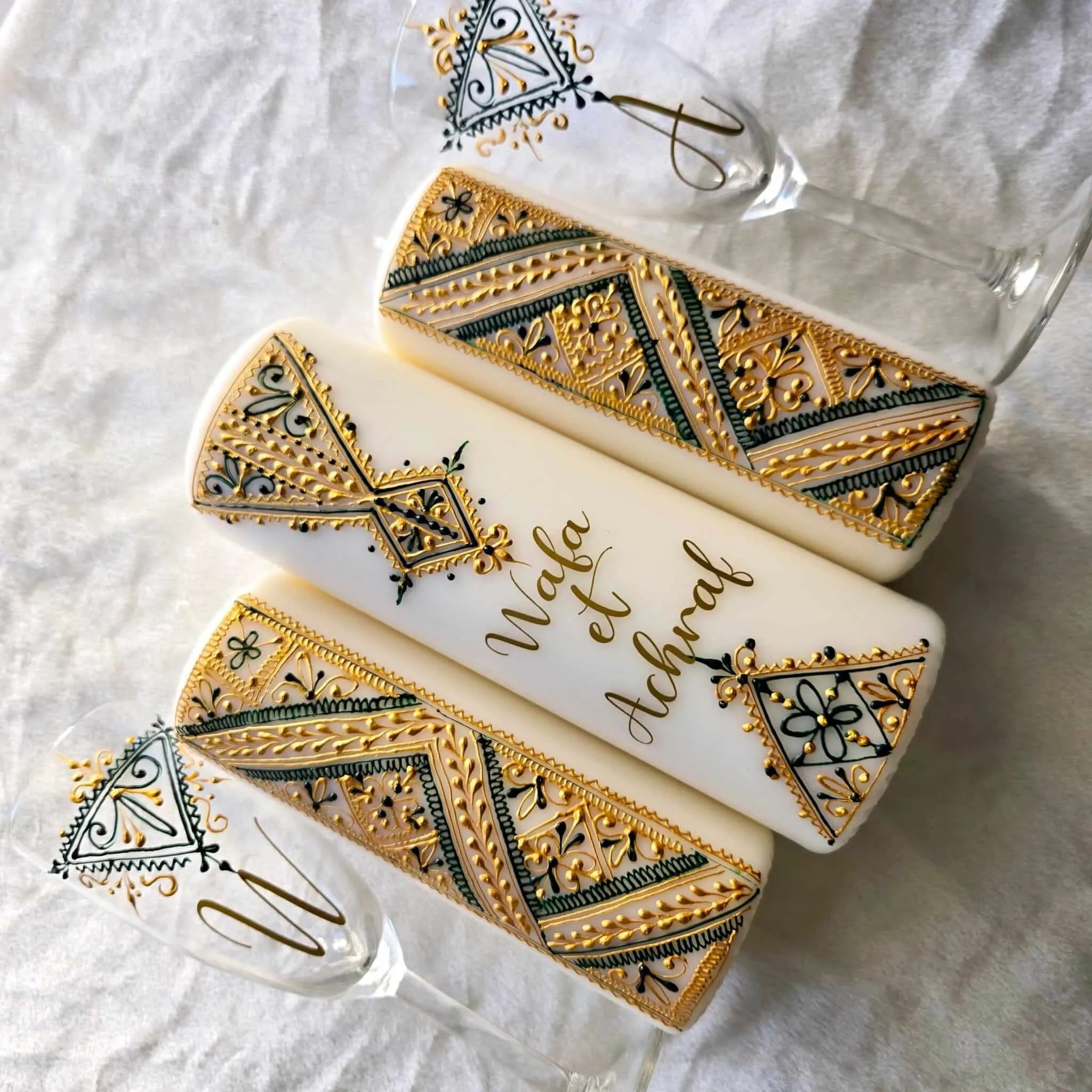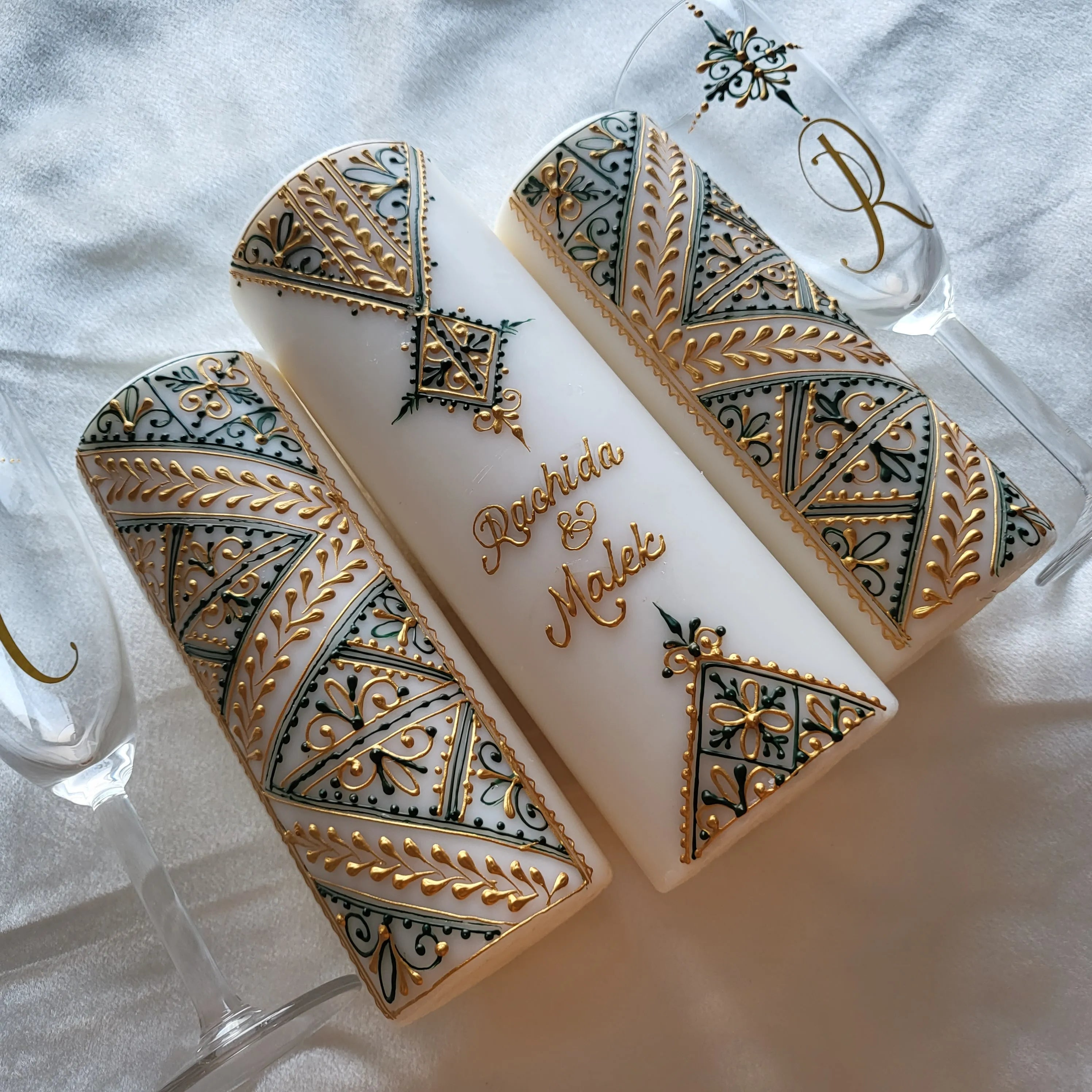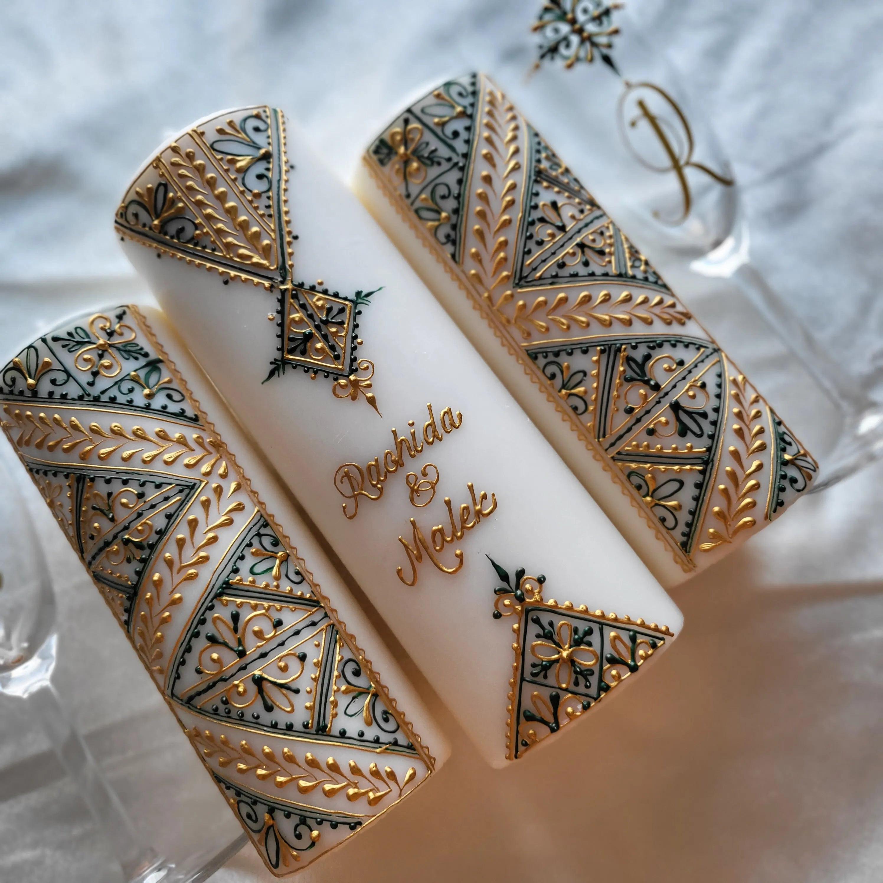Selon certaine traditions maghrébine, le jour du henné est symbolique par différentes coutumes, lors de cette soirée elle est représentée par un assortiment de bougies posé en décoration sur la table d'honneur. Les deux prénoms des futurs mariés sont inscrits sur deux bougies et ou sur la bougie centrale au choix en commentaire.