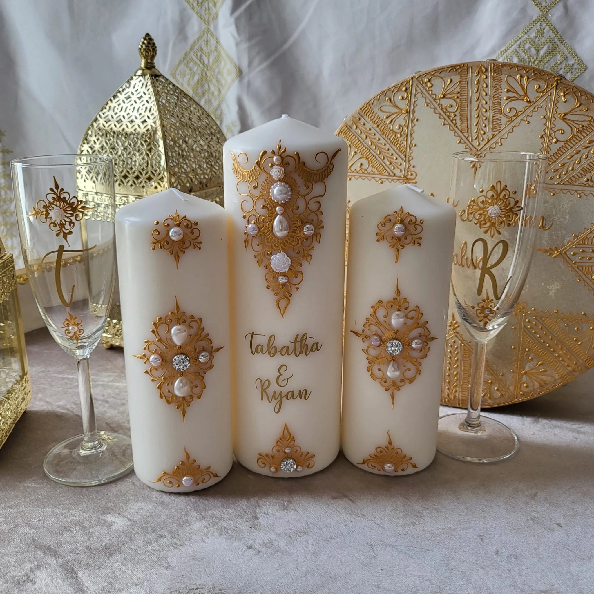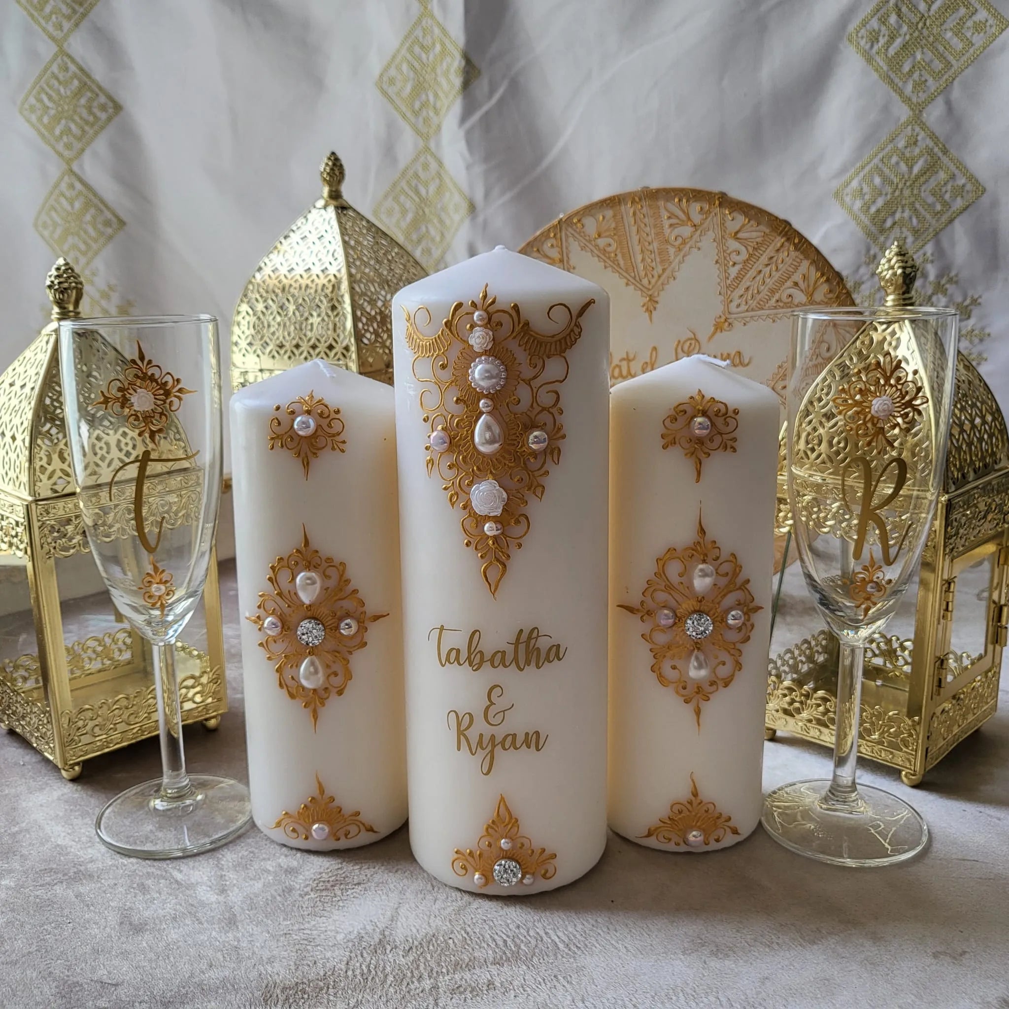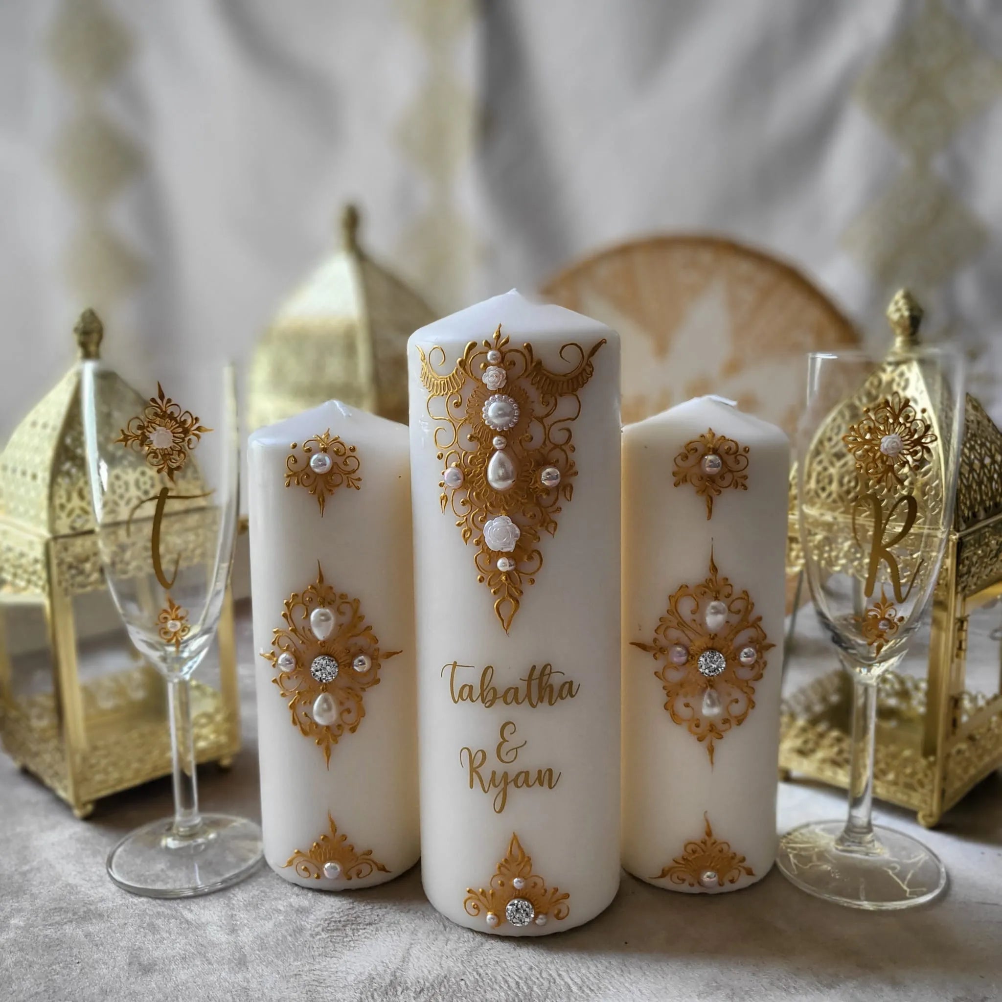 Selon certaine traditions maghrébine, le jour du henné est symbolique par différentes coutumes, lors de cette soirée elle est représentée par un assortiment de bougies posé en décoration sur la table d'honneur. Les deux prénoms des futurs mariés sont inscrits sur deux bougies et ou sur la bougie centrale au choix en commentaire.