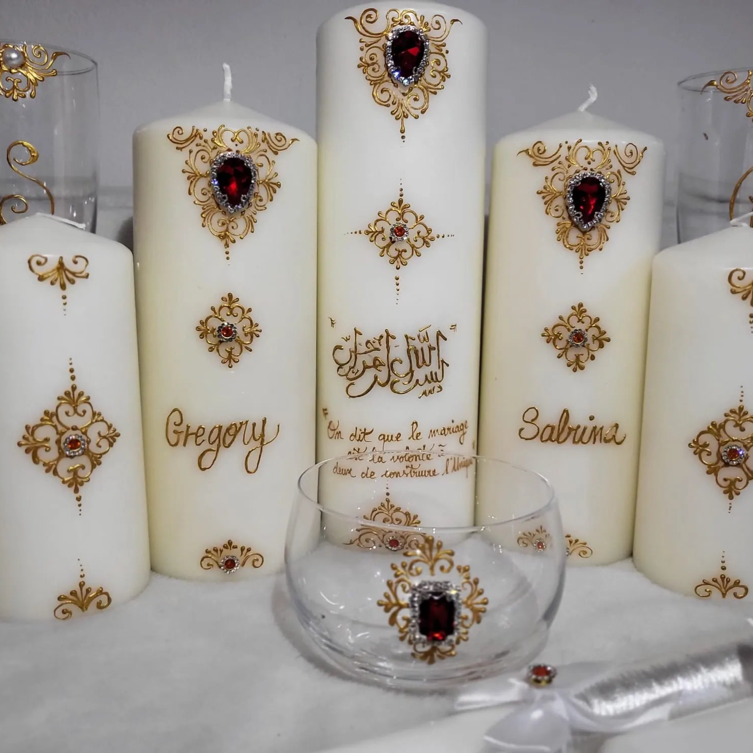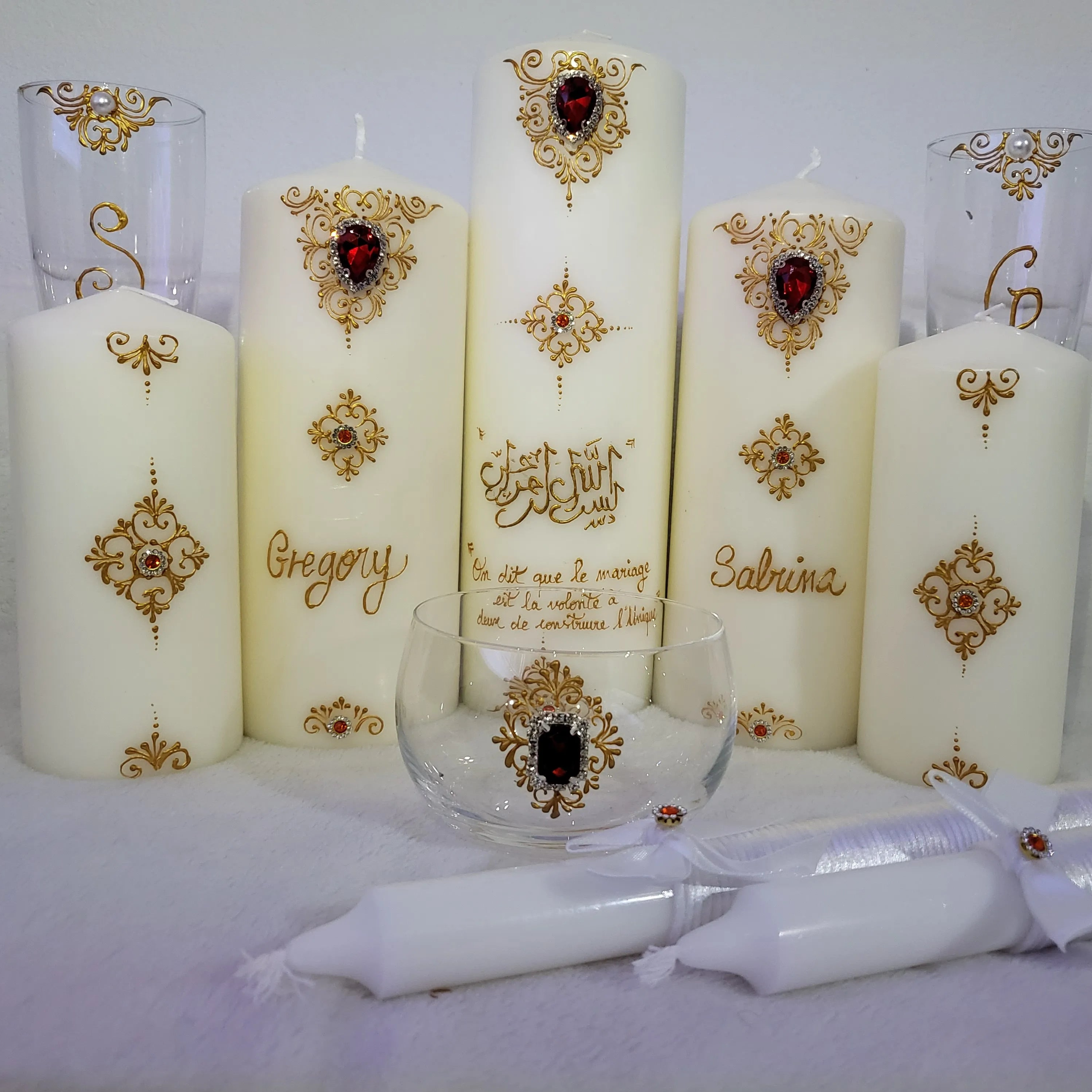 Les deux prénoms des futurs marié est inscrits sur deux bougies . Les chandeliers sont allumé au henné de la marié tout en étant accompagner de chants traditionnels et de musique orientale et ou instrumentalisé.