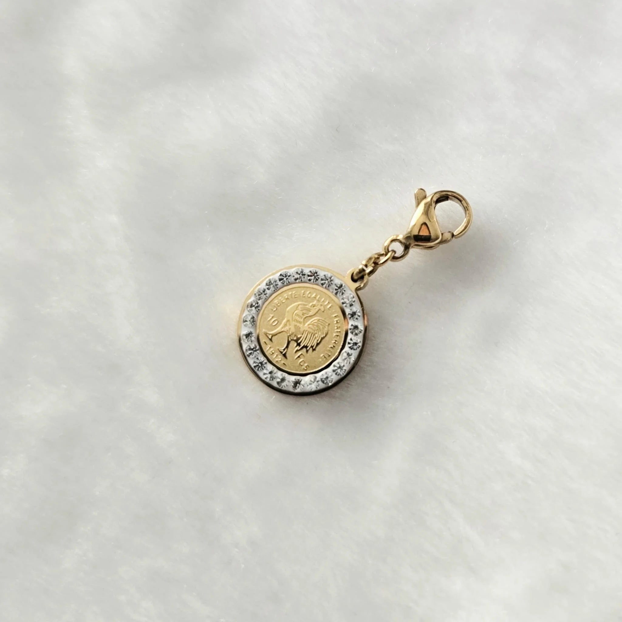 Le charms Impérial mêle mystère et éclat. Son contour scintillant encadre un médaillon gravé, rappelant les anciennes monnaies.
