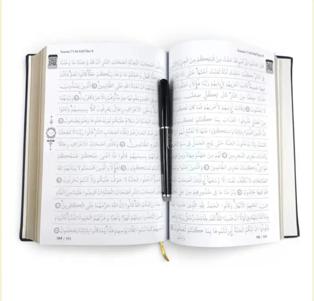 • QR code intégré : chaque ouvrage contient un QR code à scanner, donnant accès à la lecture audio des versets coraniques