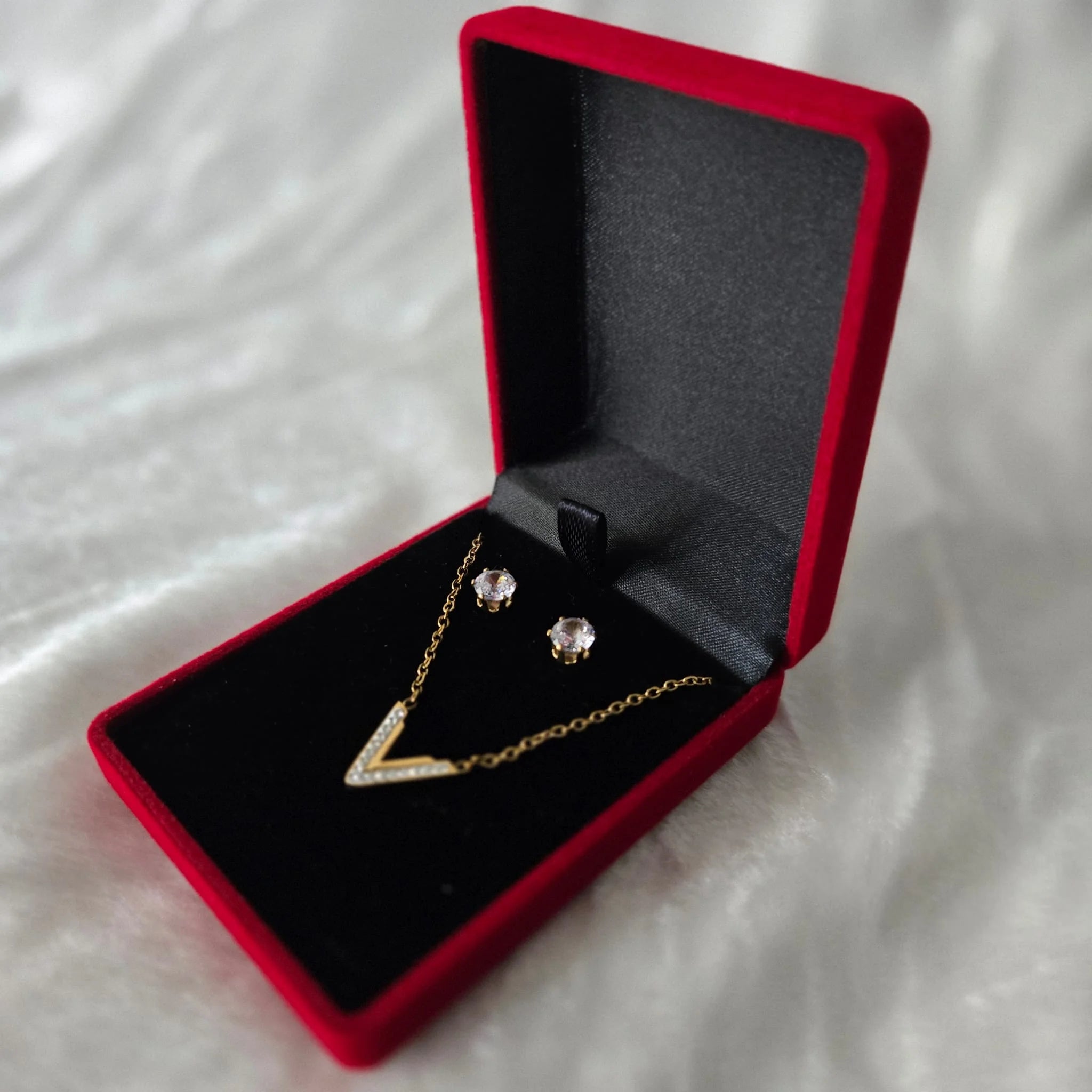 Contenu : 1 collier pendentif "V" + 1 paire de boucles d’oreilles