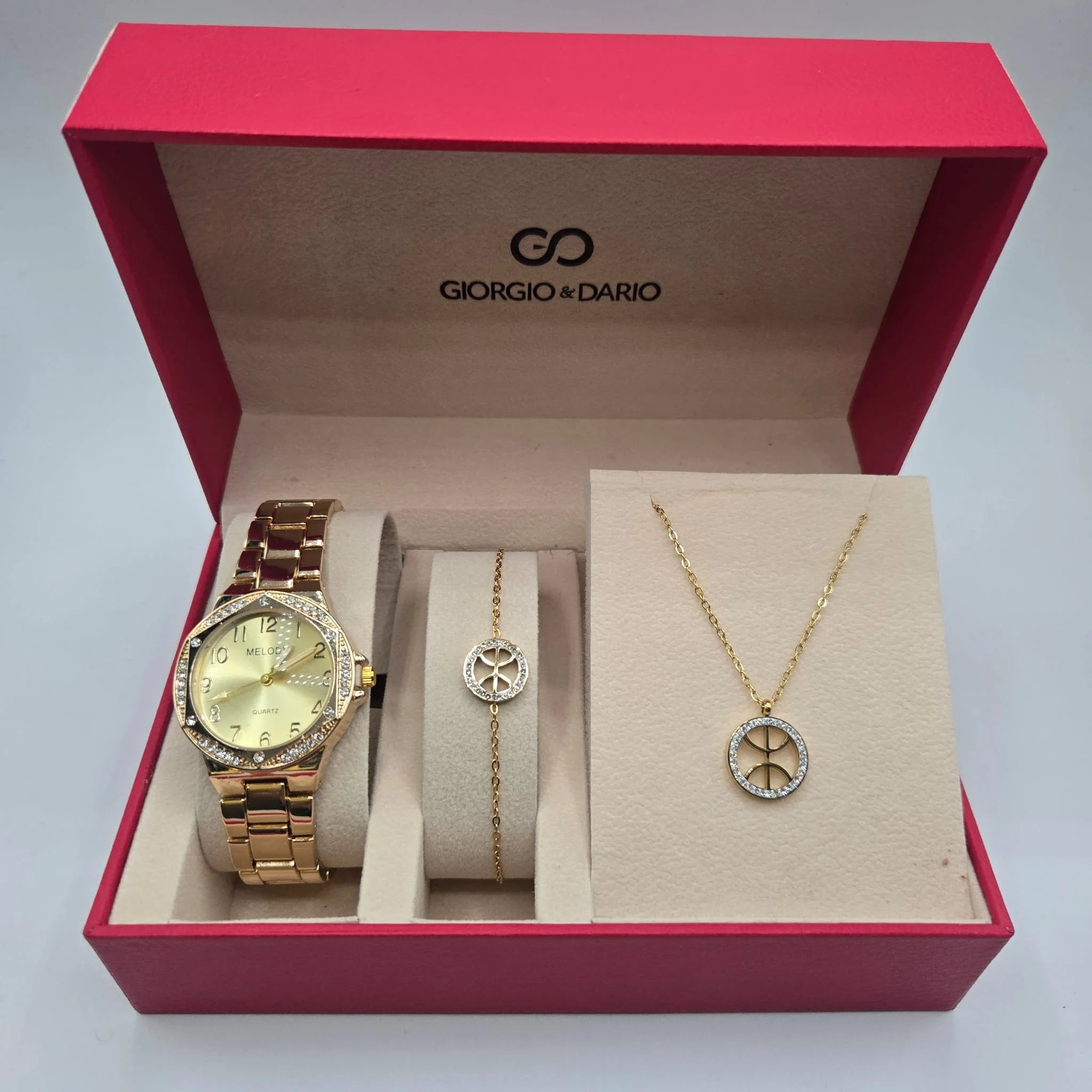 Ce coffret raffiné inclut une montre dorée, un bracelet fin orné d’un symbole de paix entouré de strass, ainsi qu’un collier assorti avec un pendentif en cercle orné du même motif iconique. Un trio chic, moderne et plein de sens.`