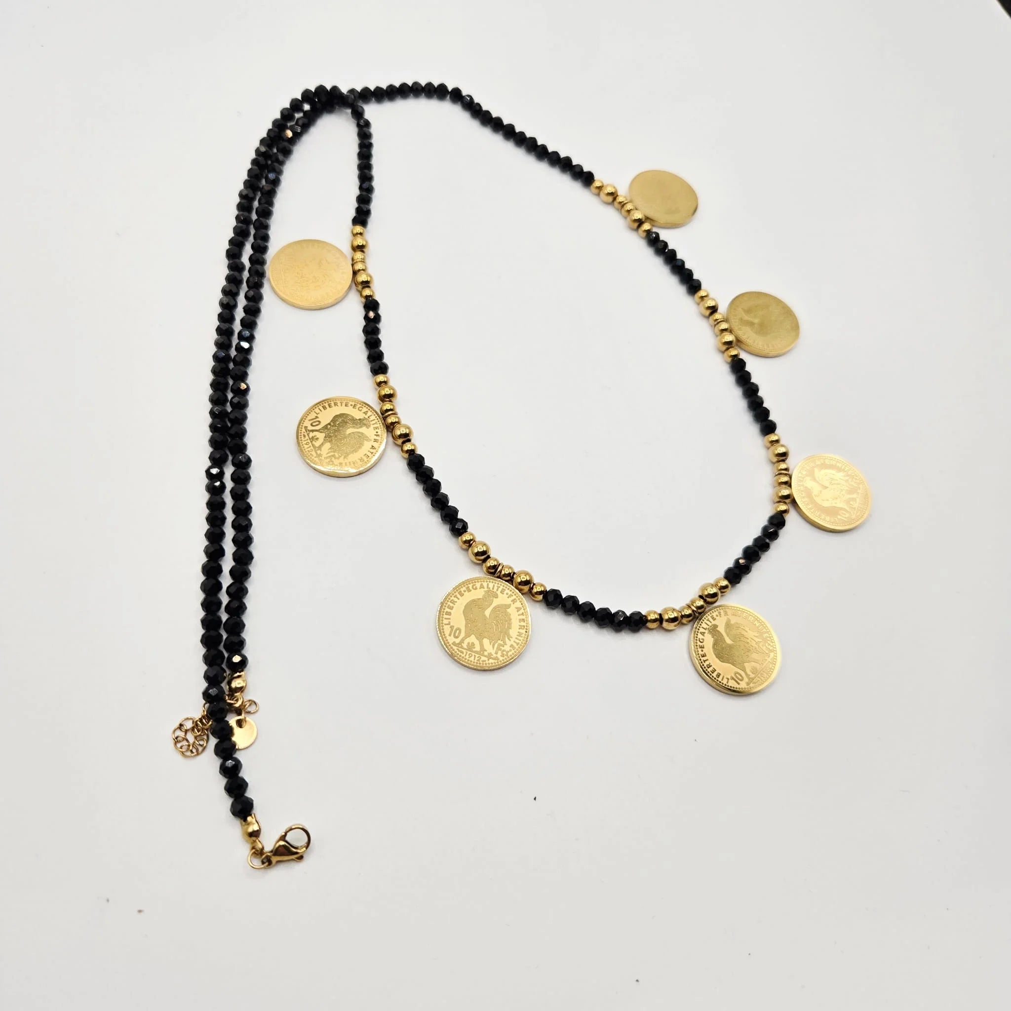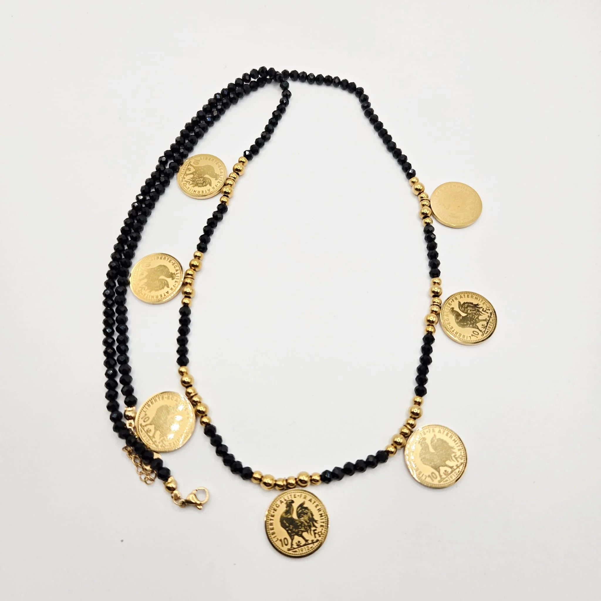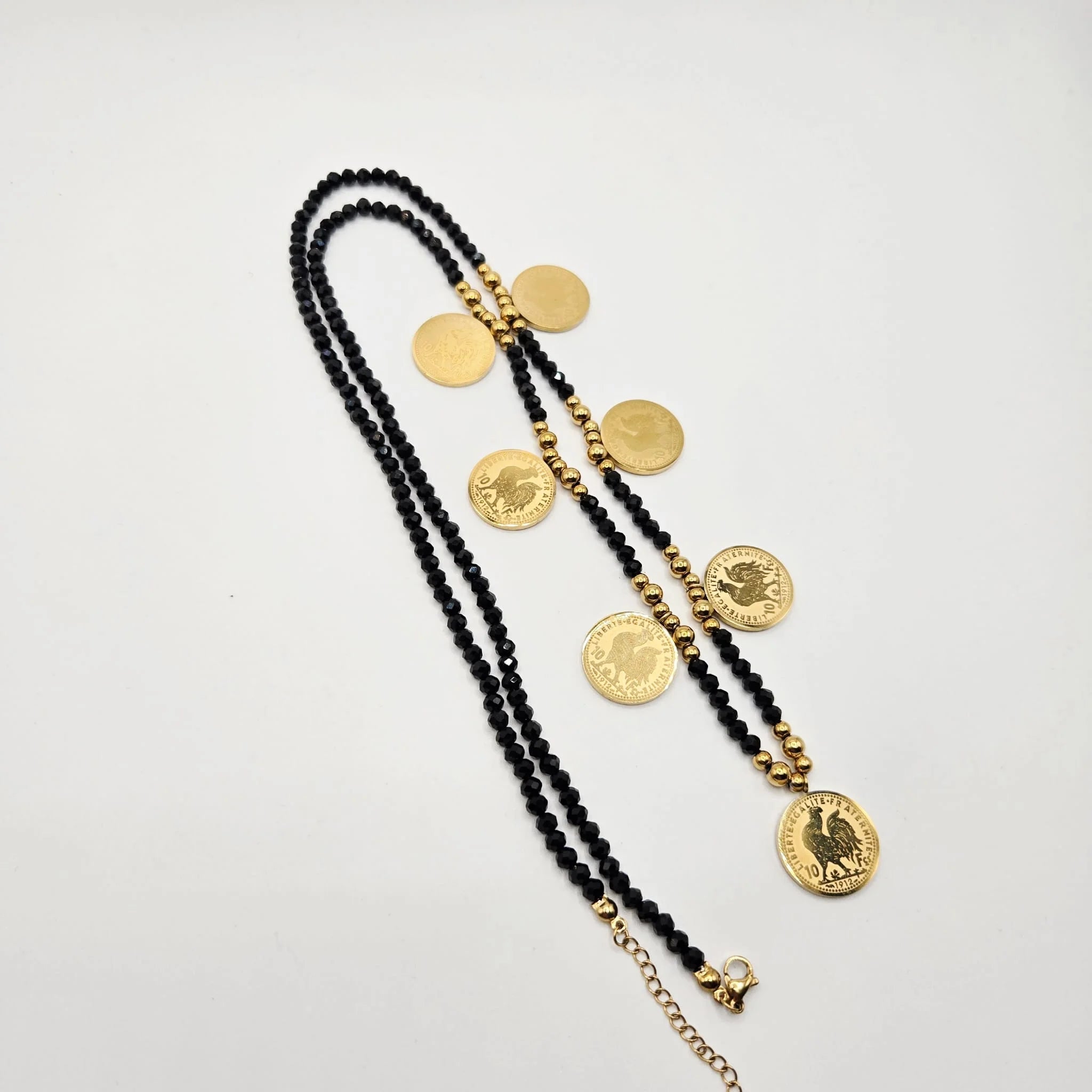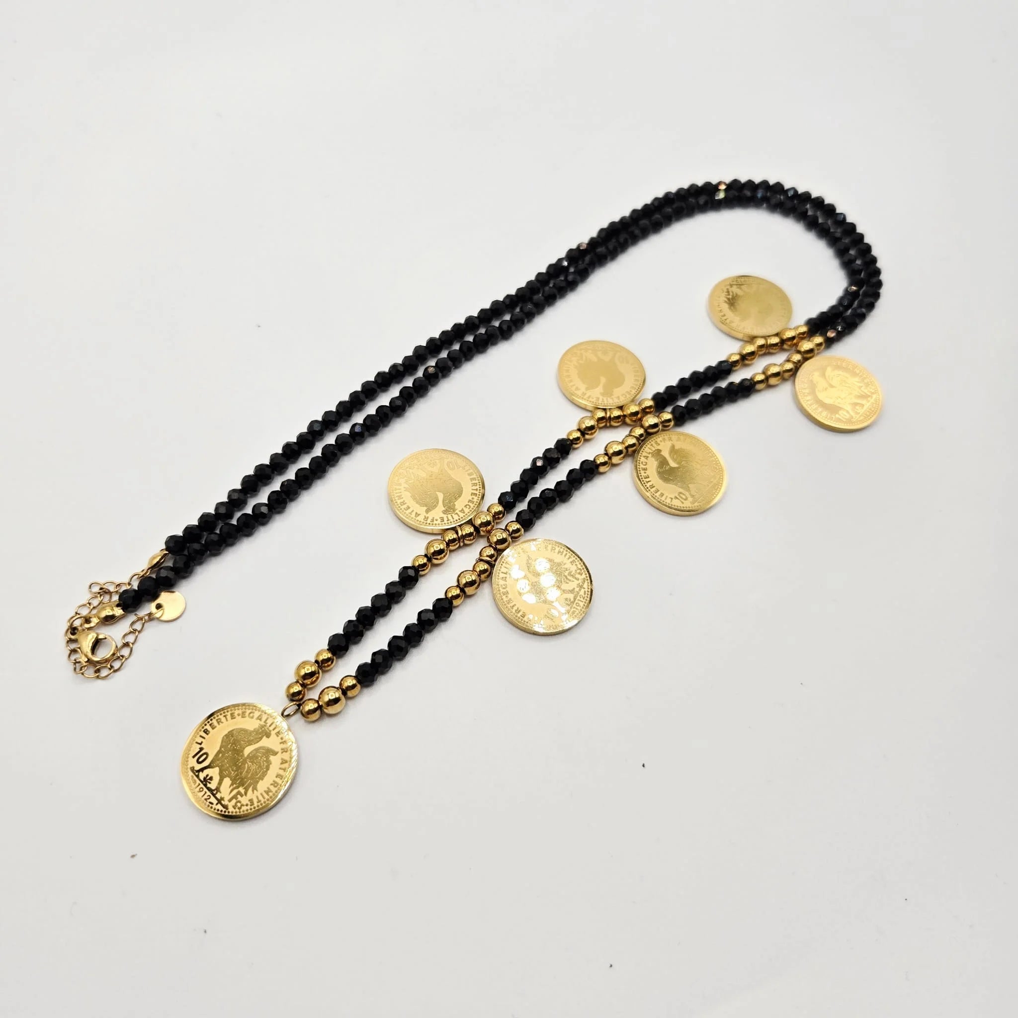 Le collier Nour Al-Mahroussa — littéralement Lumière de l’Égypte gardée — puise son essence dans les traditions orientales, mêlant l’élégance des perles noires facettées à la richesse des pièces dorées gravées.