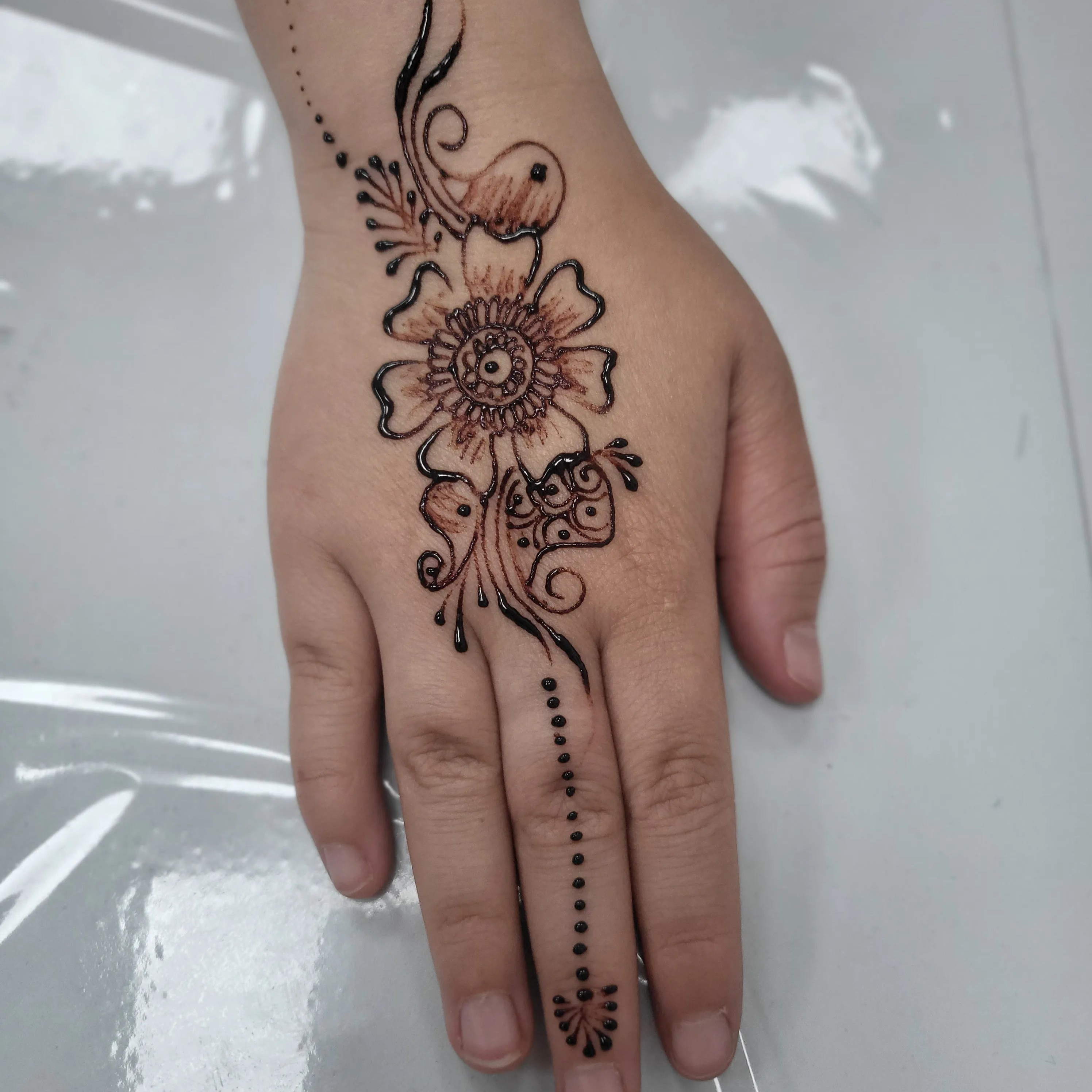 Des motifs simple-vous sont proposés, ils sont généralement représentés par un dessin allant de l'index (ou autre doigt) remontant au poignet. Différents modèles simple seront proposer sur le site. Vous avez la possibilité de sélectionner la photo correspondant au model toutefois si vous disposez d'un model en photo la hennaya pourra effectuer le même dessin sur vos mains. Ces motifs nécessitent 30 a 45mn en temps de réalisation.